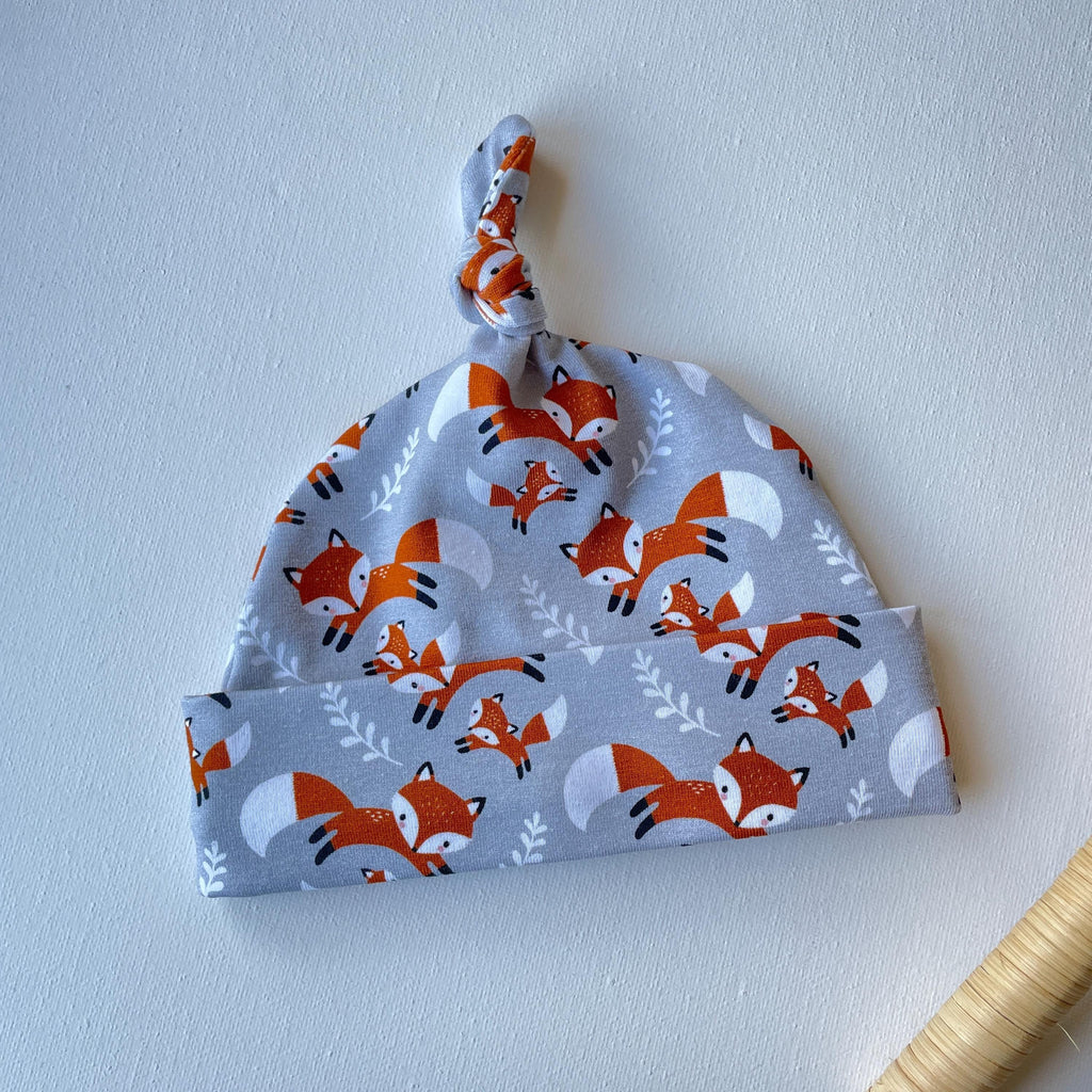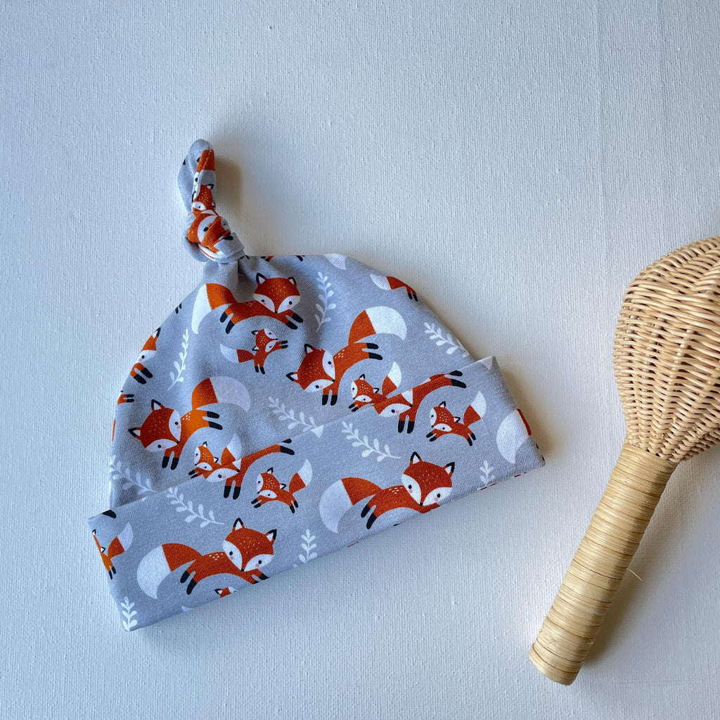 Dit grijze babyknoopmutsje houdt de oortjes van je kleintje warm en knus. Gemaakt van zachte katoenjersey met vossen, met een omgeslagen band die comfortabel op zijn plaats blijft.